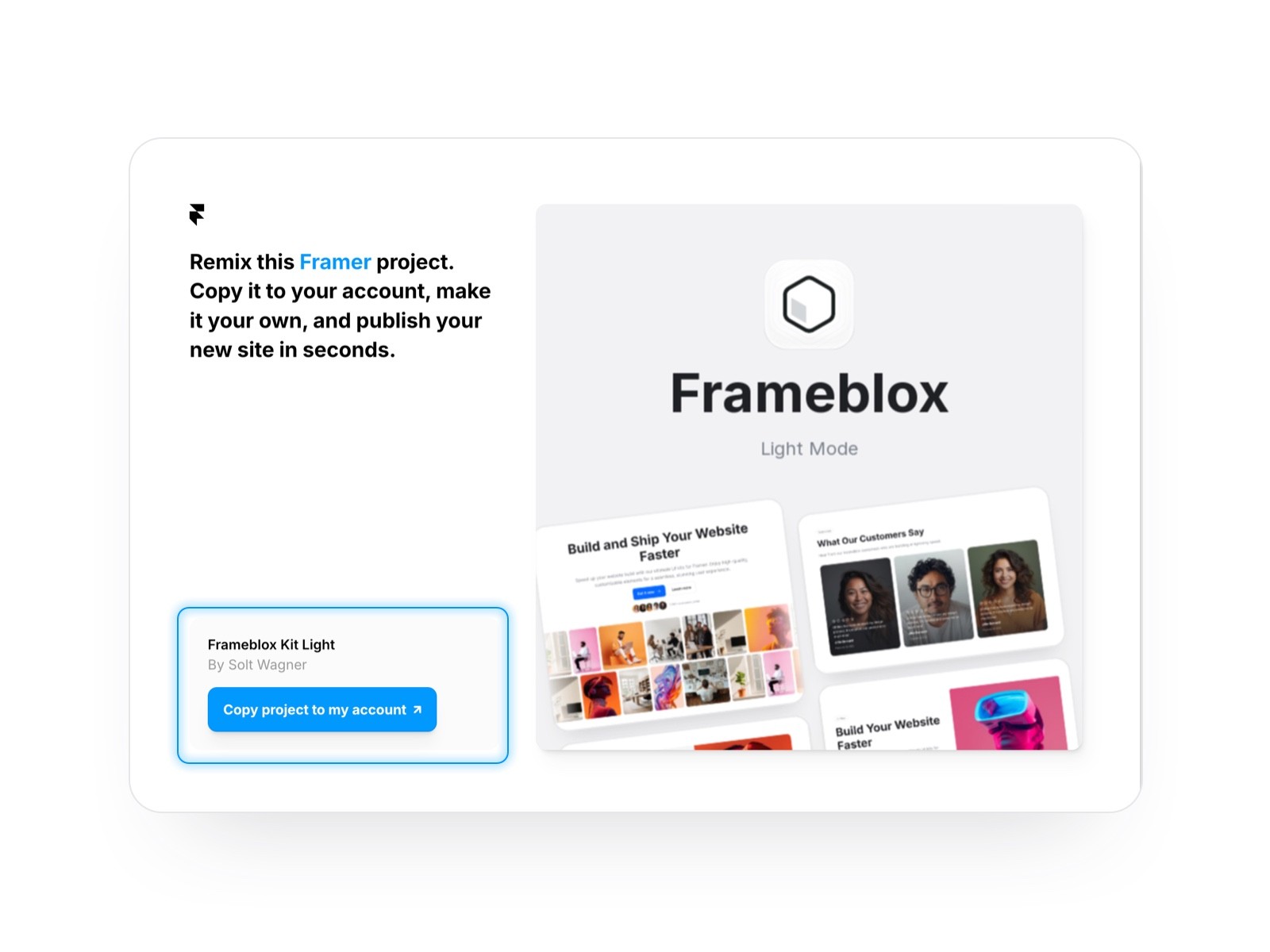 After clicking the Light or Dark version Remix link, sign in or sign up for a free Framer account. Then, click the "Copy projects to my account" button. Once the full UI kit is duplicated in your account, you can easily start building websites.