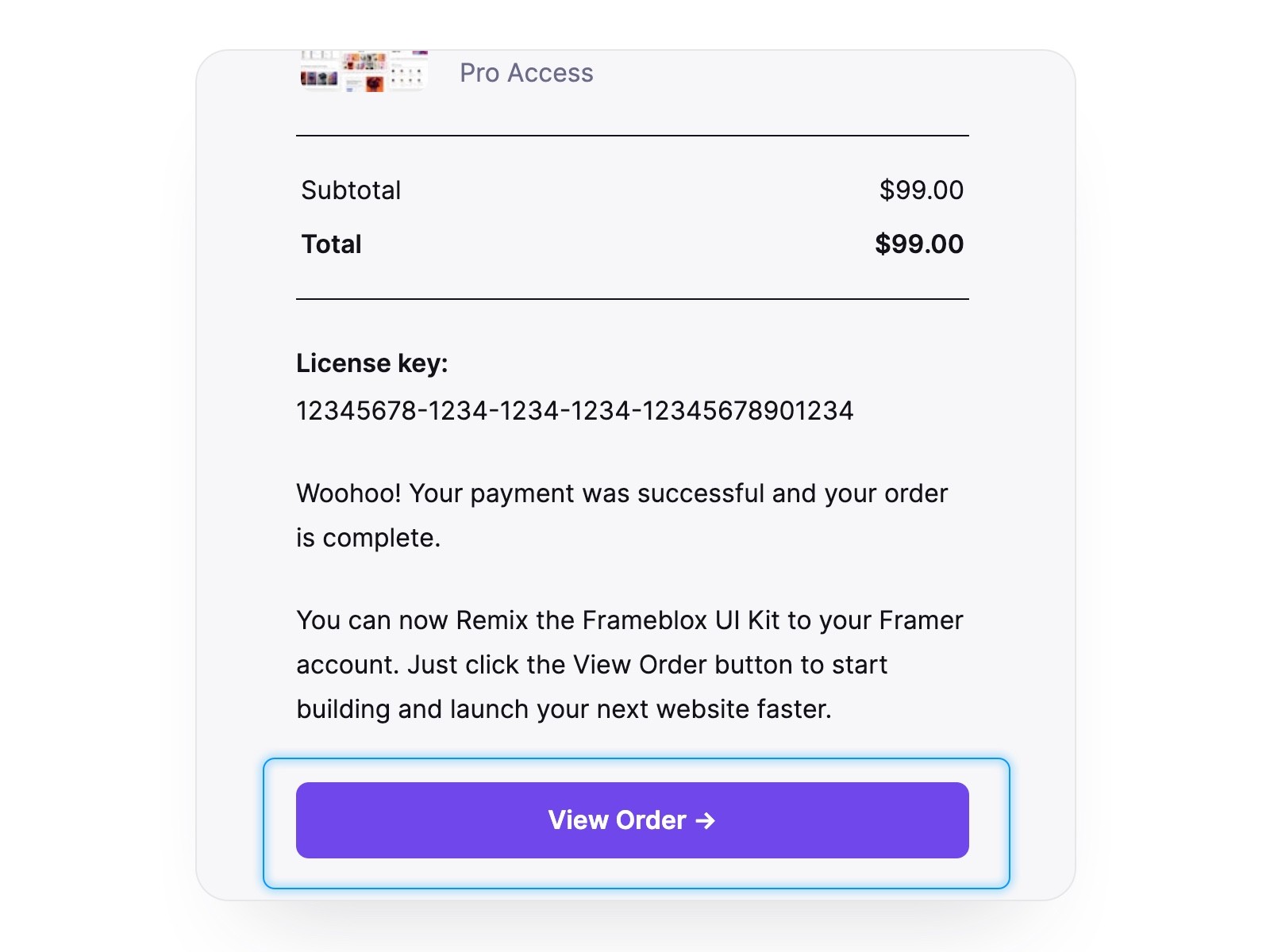 After a successful purchase, you will see a popup modal. Click the "View Order" button.