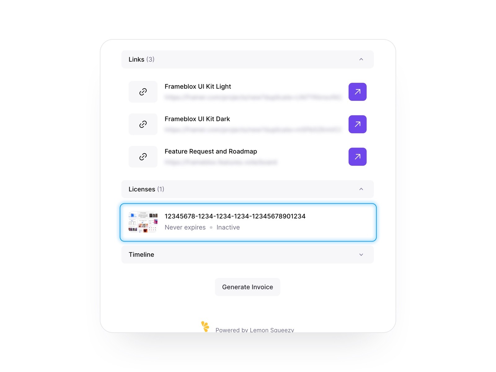 On the right sidebar, you'll find a "Licenses" section. Here, you can copy your license key directly or click it to open a new modal.