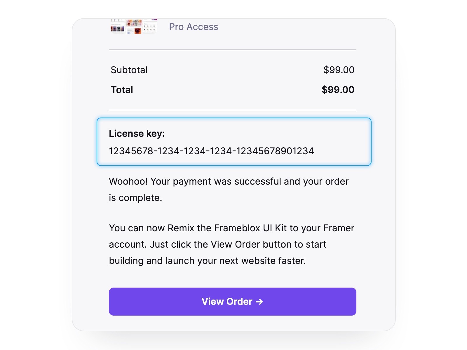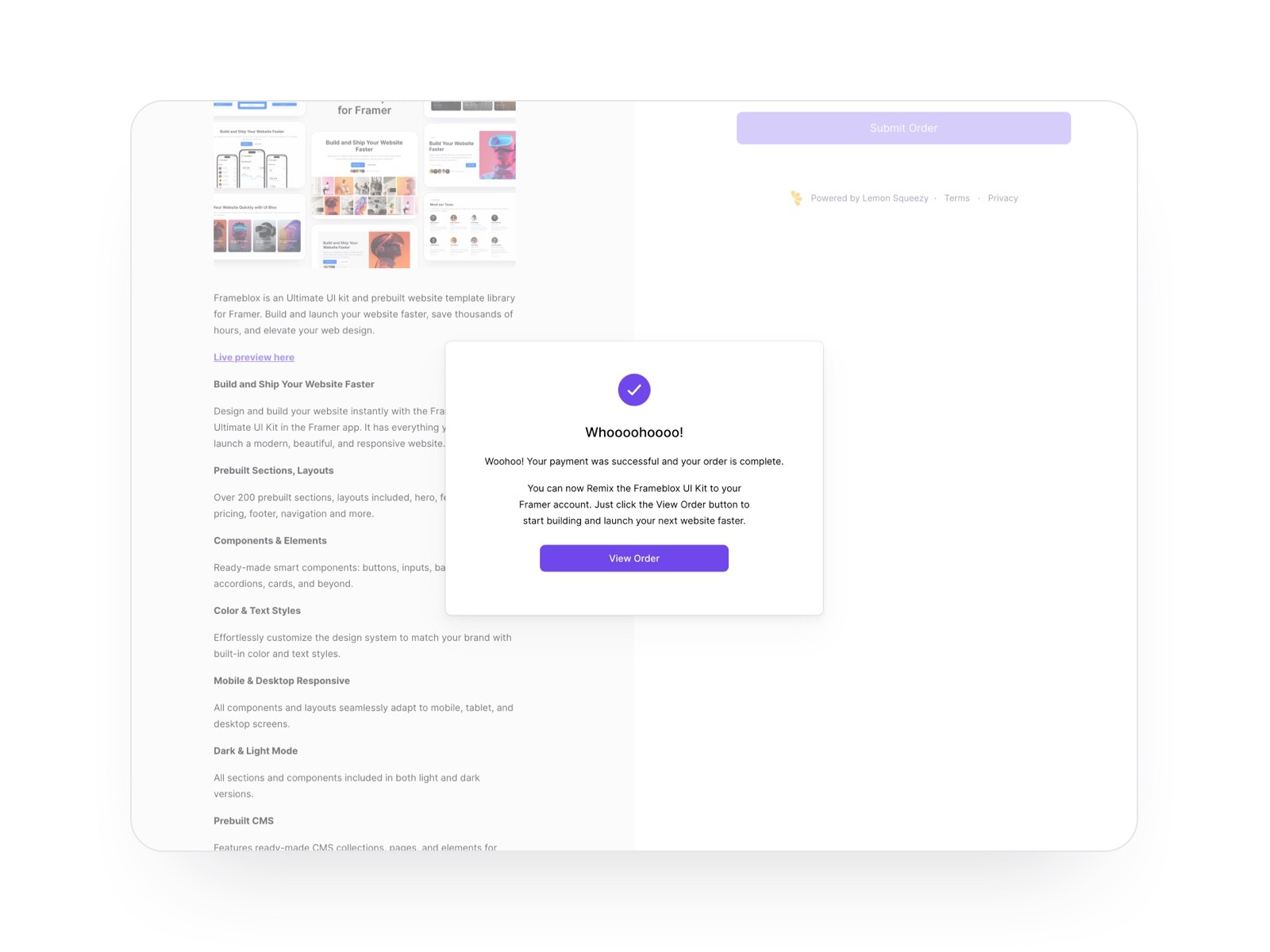 After a successful purchase, you will see a popup. Then, click the "View Order" button.