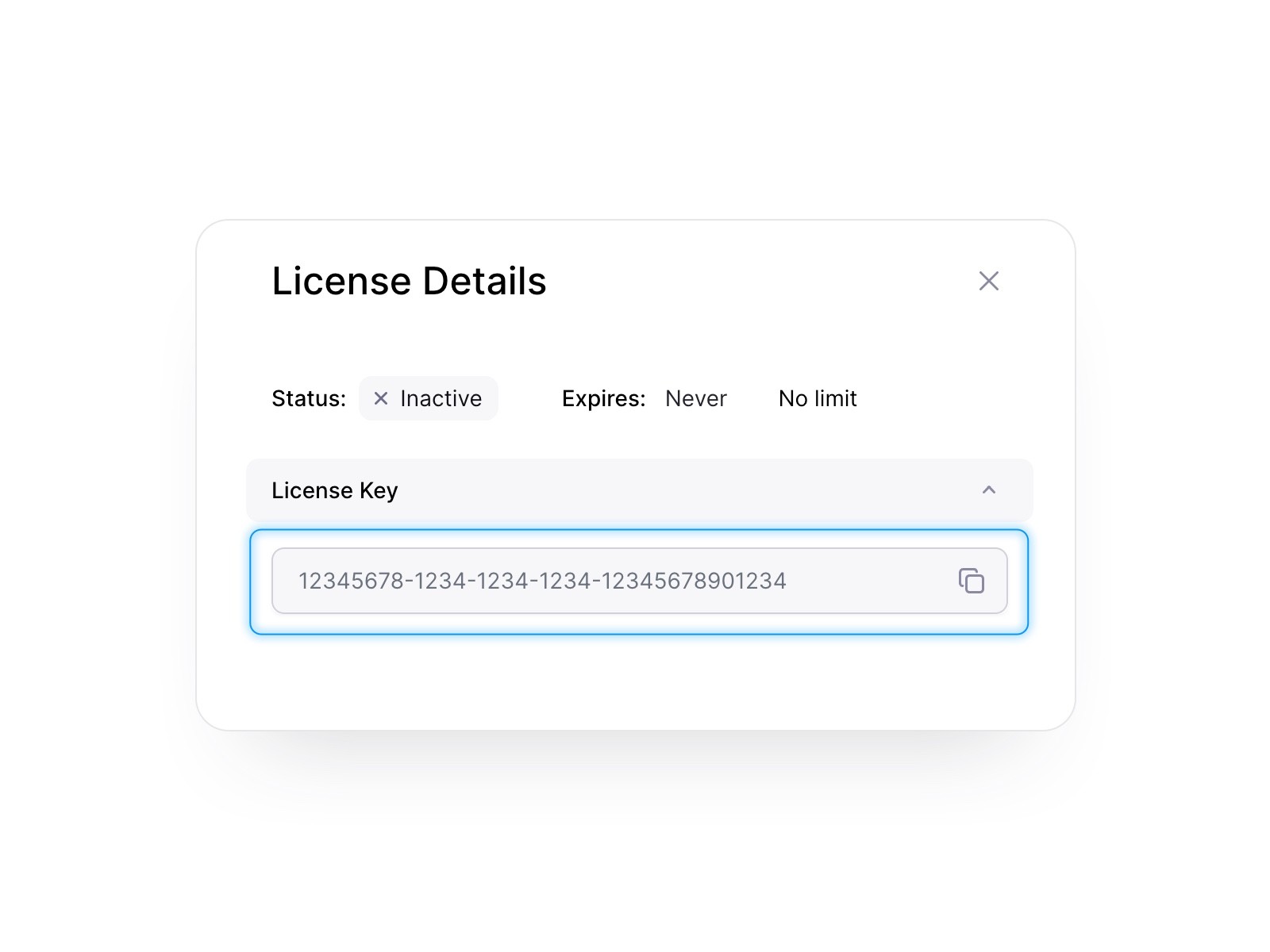 After clicking the license key, the License Details modal opens. You can then click the copy button at the end of the license key input.